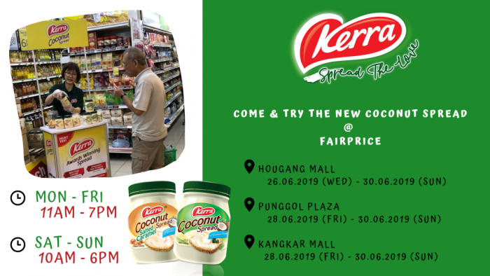 June 26, 2019Kerra Sampling Outlets in SingaporeKerra 1 Coconut Spread is now spreading its goodness to everyone @ FairPrice Singapore! Wonder how does it taste like? Now is the chance to come and try it yourself! Made from pure...Read More >> -